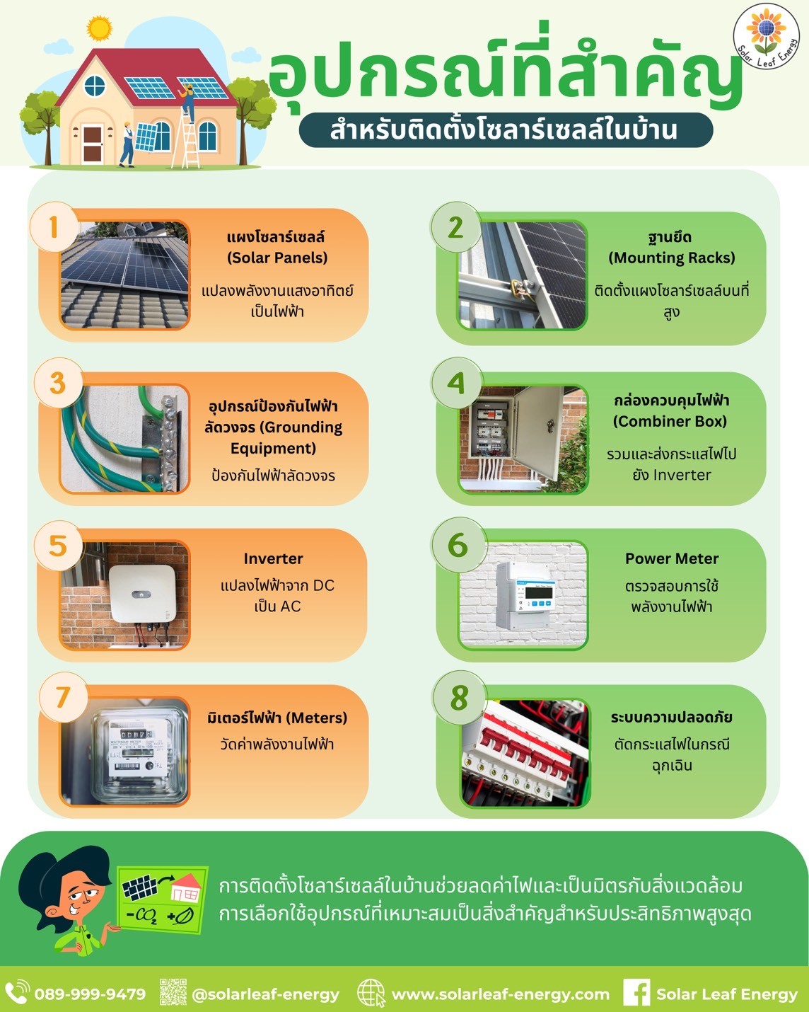 อุปกรณ์หลักที่จำเป็นในการติดตั้งโซลาร์เซลล์ในบ้านมีดังนี้