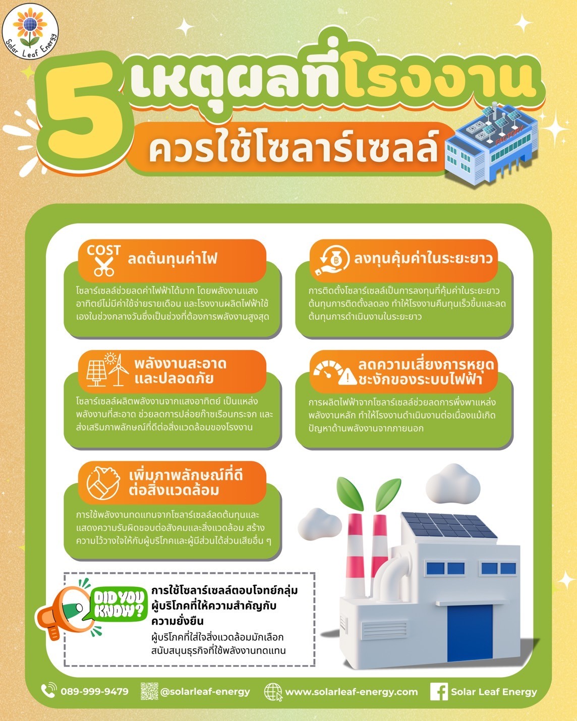โรงงานอุตสาหกรรมมีพื้นที่หลังคาที่กว้างขวางและเหมาะสมอย่างยิ่งต่อการติดตั้งแผงโซลาร์เซลล์ การผลิตไฟฟ้าจากโซลาร์เซลล์ในเวลากลางวันตรงกับความต้องการใช้พลังงานสูงสุดของโรงงาน ซึ่งทำให้เกิดการใช้ทรัพยากรอย่างมีประสิทธิภาพ นอกจากนี้ ด้วยการติดตั้งที่ง่ายและเทคโนโลยีที่พัฒนา โรงงานสามารถเปลี่ยนแสงแดดเป็นพลังงานที่ใช้ได้จริง โดยไม่ต้องเสียค่าใช้จ่ายเพิ่มขึ้นในระยะยาว