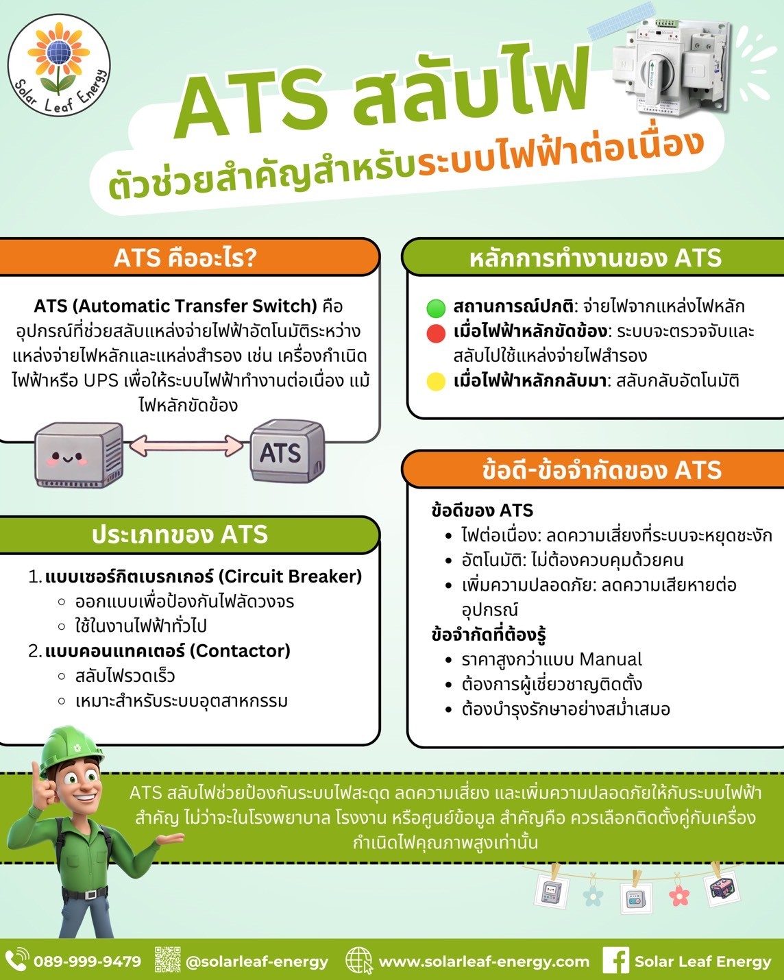 คุณเคยเจอปัญหาไฟดับหรือไฟกระตุกบ่อยๆ จนระบบเครื่องใช้ไฟฟ้าสำคัญในบ้านหรือธุรกิจได้รับผลกระทบไหม?ในโลกที่การพึ่งพาไฟฟ้ามีความสำคัญอย่างมาก ทั้งบ้านเรือน โรงงาน หรือโรงพยาบาล ต่างต้องการระบบไฟฟ้าที่ ต่อเนื่อง และ ปลอดภัย เพื่อป้องกันความเสียหายที่อาจเกิดขึ้นจากไฟฟ้าขัดข้อง วันนี้เราขอแนะนำอุปกรณ์ที่ชื่อว่า ATS หรือ Automatic Transfer Switch