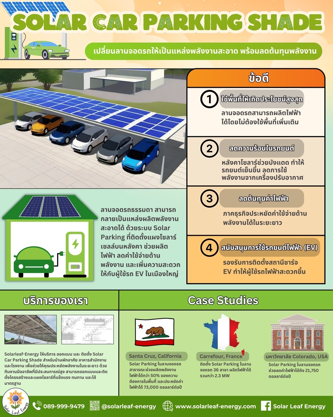 รู้หรือไม่ว่า…ลานจอดรถธรรมดาที่ดูเหมือนไม่ได้ใช้งานอะไรนอกจากการจอดรถ สามารถกลายเป็นแหล่งผลิตพลังงานสะอาดได้อย่างมีประสิทธิภาพ ด้วยระบบ Solar Car Parking Shade ที่ติดตั้งแผงโซลาร์เซลล์บนหลังคาลานจอดรถ ไม่เพียงแค่ช่วยให้ร่มเงาแก่รถยนต์เท่านั้น แต่ยังช่วยผลิตไฟฟ้าใช้ในสถานที่ใกล้เคียง หรือรองรับการติดตั้งสถานีชาร์จรถยนต์ไฟฟ้า (EV Charging Station) ได้อีกด้วย!