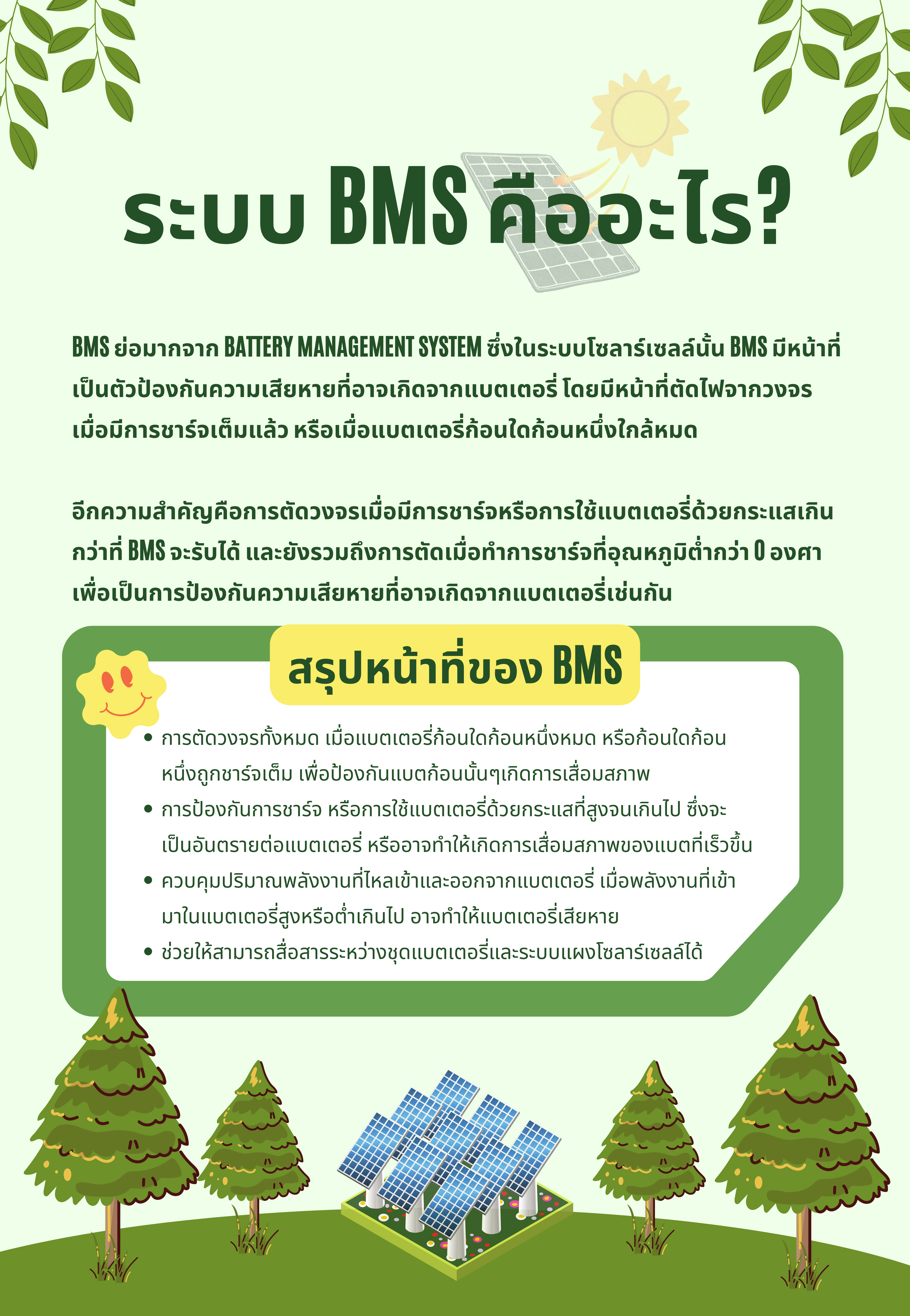 BMS ย่อมากจาก Battery Management System ซึ่งในระบบโซลาร์เซลล์นั้น BMS มีหน้าที่เป็นตัวป้องกันความเสียหายที่อาจเกิดจากแบตเตอรี่ โดยมีหน้าที่ตัดไฟจากวงจรเมื่อมีการชาร์จเต็มแล้ว หรือเมื่อแบตเตอรี่ก้อนใดก้อนหนึ่งใกล้หมด