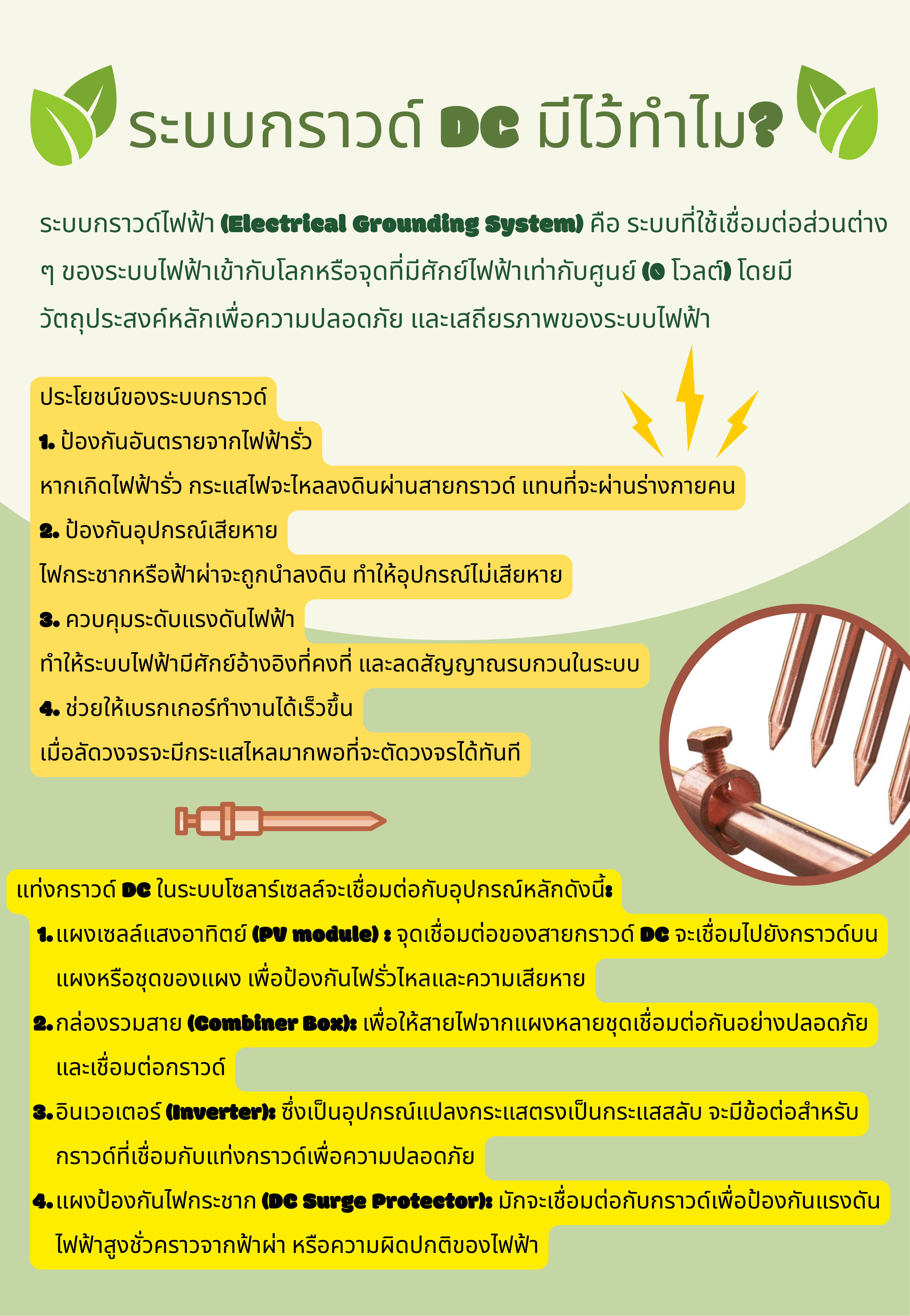 1. แผงเซลล์แสงอาทิตย์ (PV module) : จุดเชื่อมต่อของสายกราวด์ DC จะเชื่อมไปยังกราวด์บนแผงหรือชุดของแผง เพื่อป้องกันไฟรั่วไหลและความเสียหาย