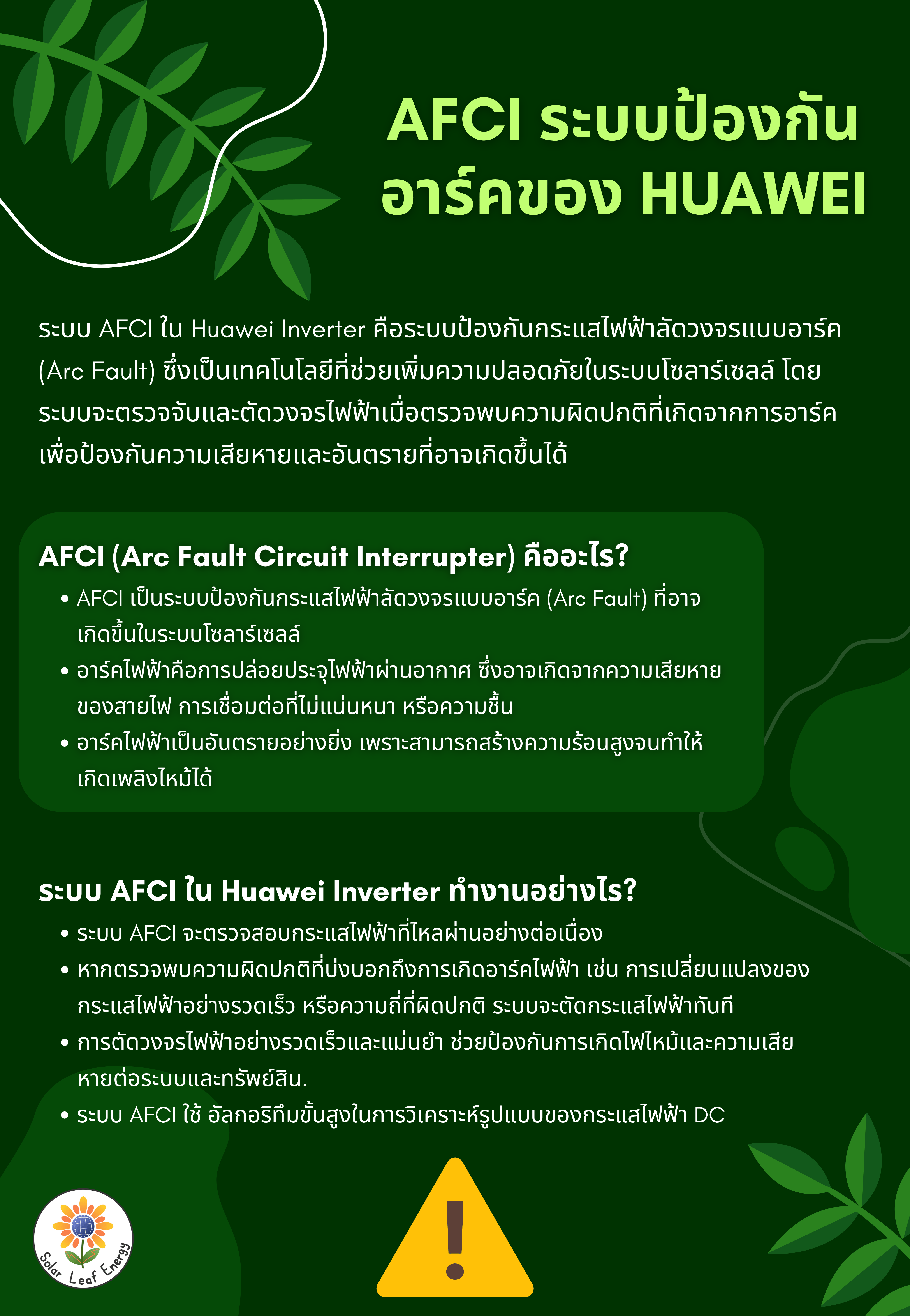 ระบบ AFCI ใน Huawei Inverter คือระบบป้องกันกระแสไฟฟ้าลัดวงจรแบบอาร์ค (Arc Fault) ซึ่งเป็นเทคโนโลยีที่ช่วยเพิ่มความปลอดภัยในระบบโซลาร์เซลล์ โดยระบบจะตรวจจับและตัดวงจรไฟฟ้าเมื่อตรวจพบความผิดปกติที่เกิดจากการอาร์ค เพื่อป้องกันความเสียหายและอันตรายที่อาจเกิดขึ้นได้