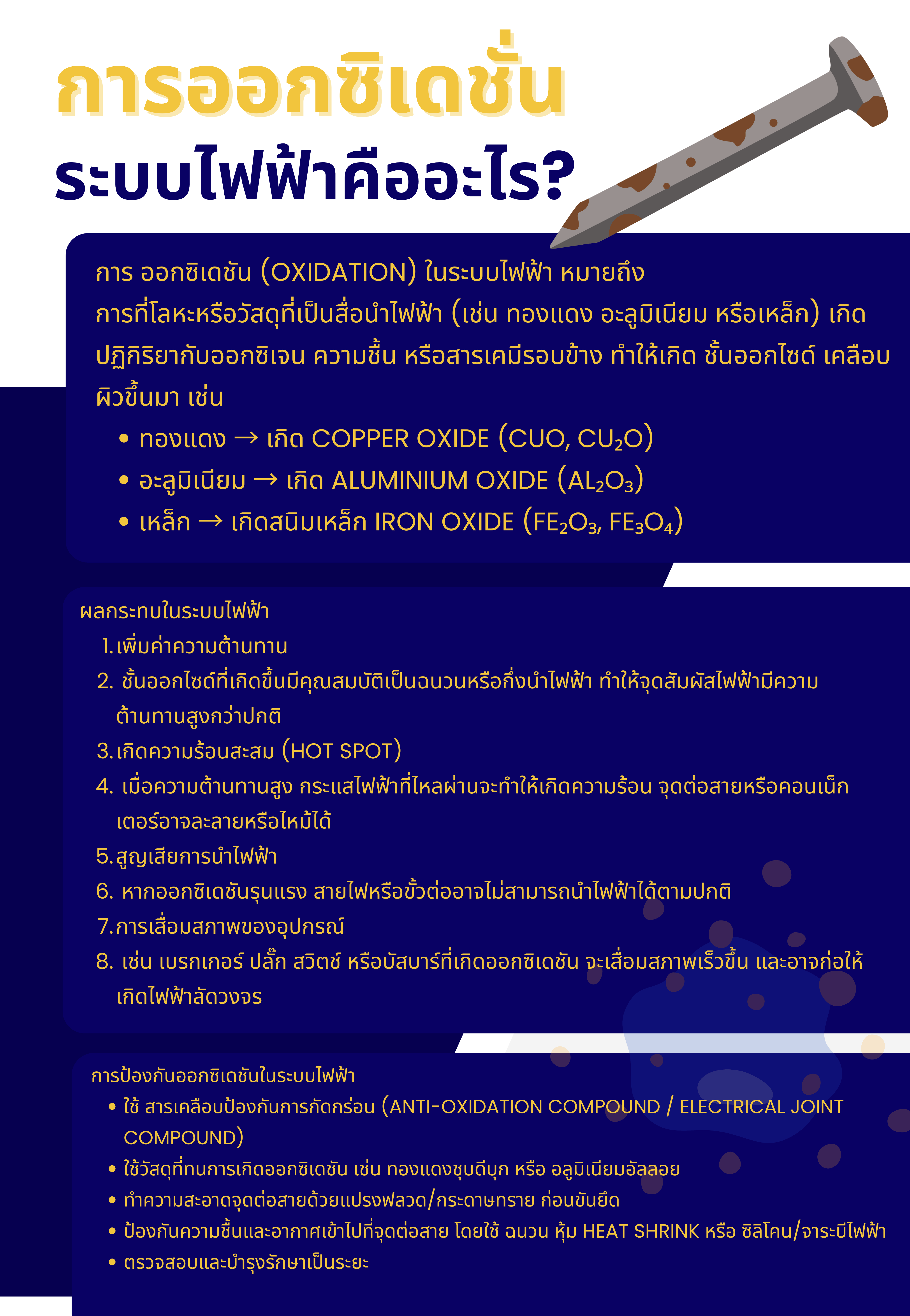 - หากออกซิเดชันรุนแรง สายไฟหรือขั้วต่ออาจไม่สามารถนำไฟฟ้าได้ตามปกติ
