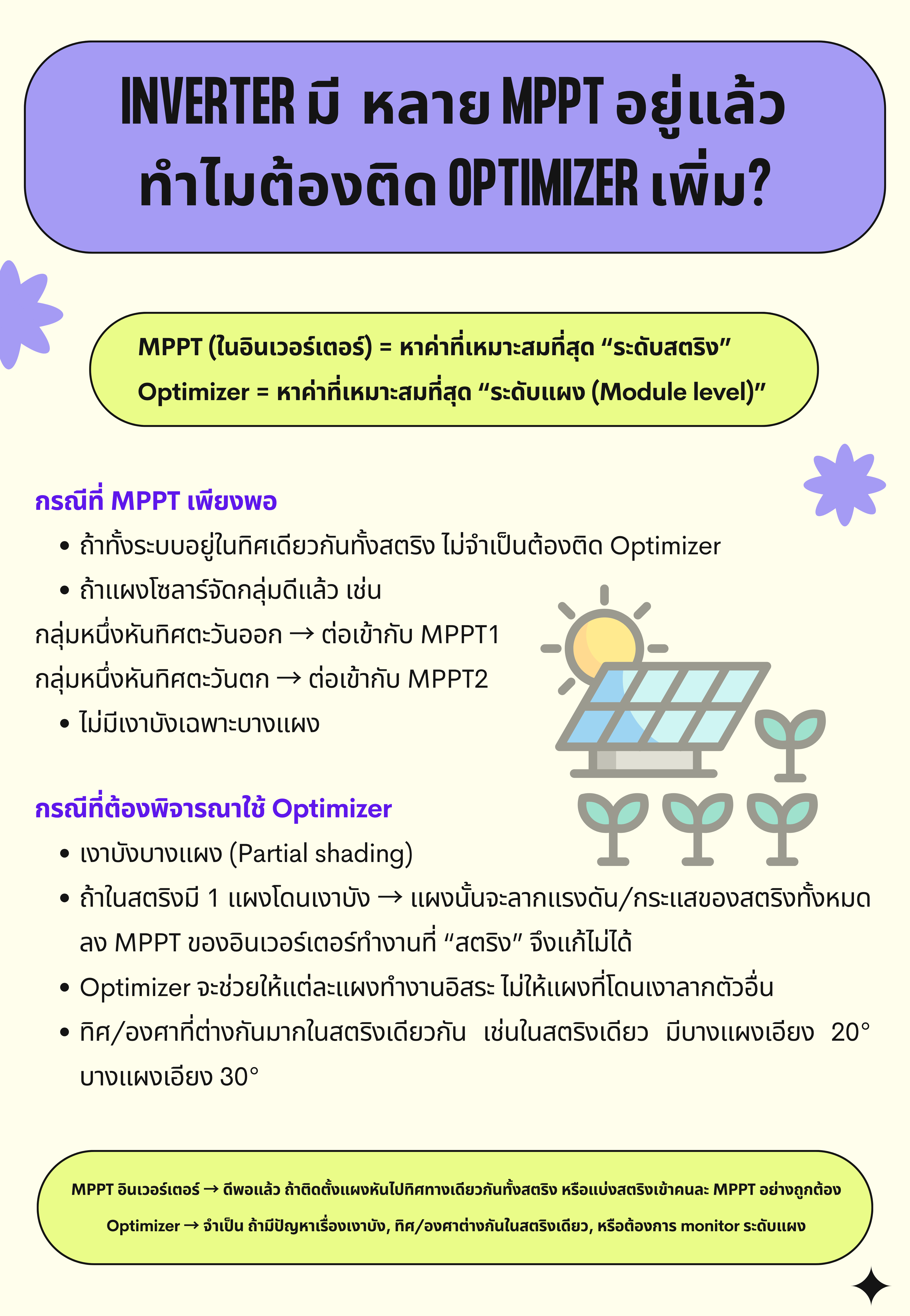 Optimizer → จำเป็น ถ้ามีปัญหาเรื่องเงาบัง, ทิศ/องศาต่างกันในสตริงเดียว, หรือต้องการ monitor ระดับแผง