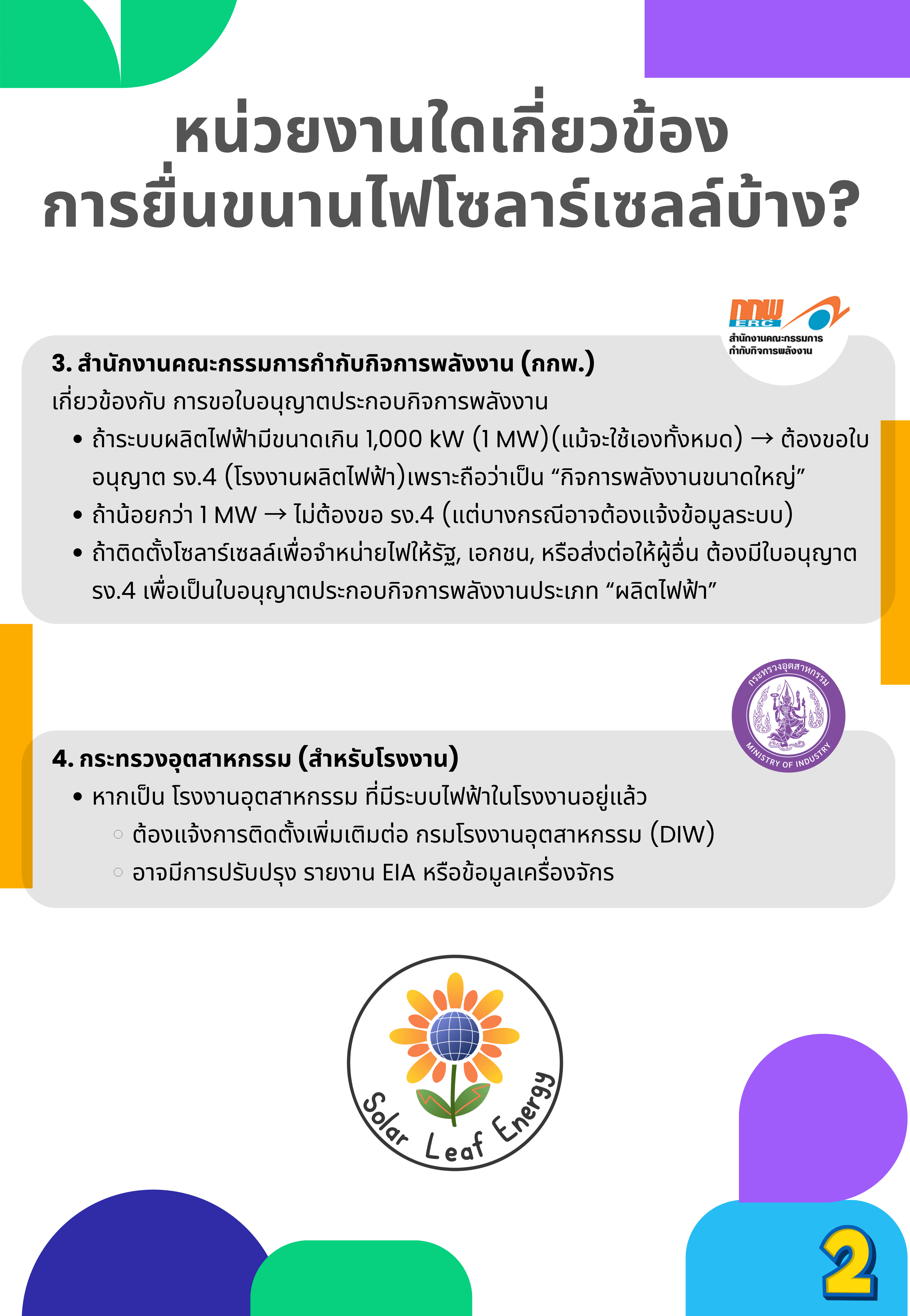 - หากเป็น โรงงานอุตสาหกรรม ที่มีระบบไฟฟ้าในโรงงานอยู่แล้วต้องแจ้งการติดตั้งเพิ่มเติมต่อ กรมโรงงานอุตสาหกรรม (DIW)