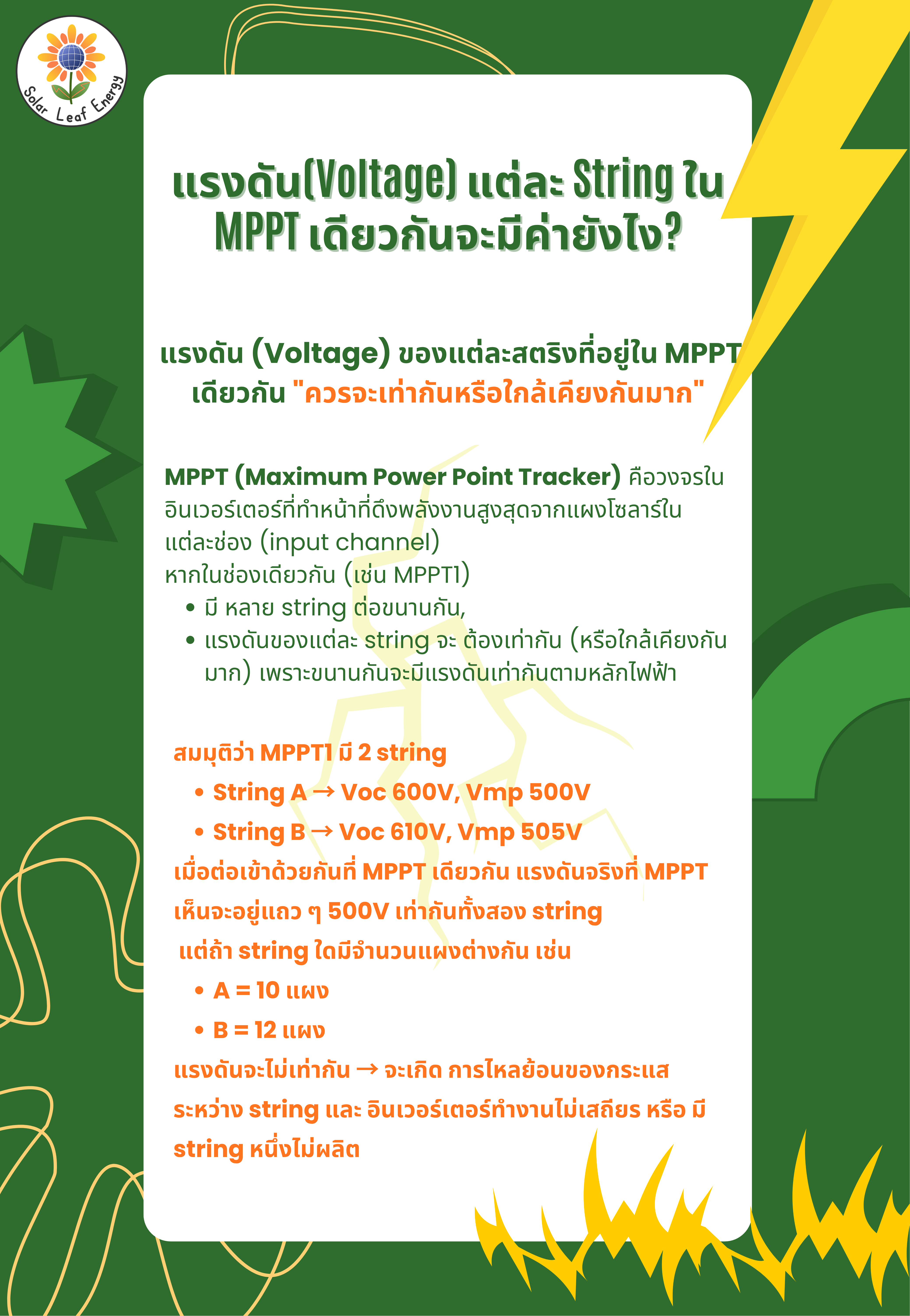 แรงดัน (Voltage) ของแต่ละสตริงที่อยู่ใน MPPT เดียวกัน "ควรจะเท่ากันหรือใกล้เคียงกันมาก"